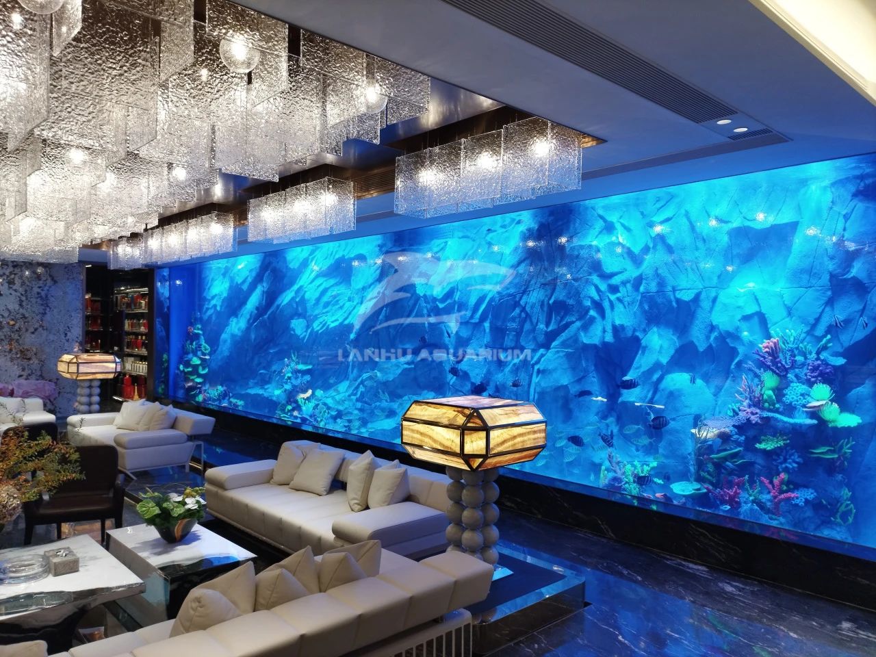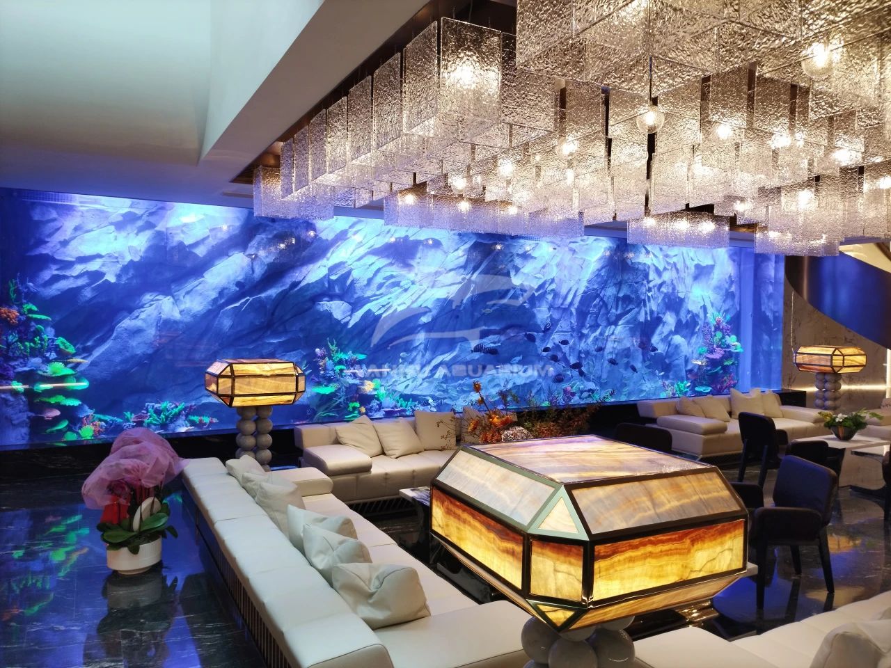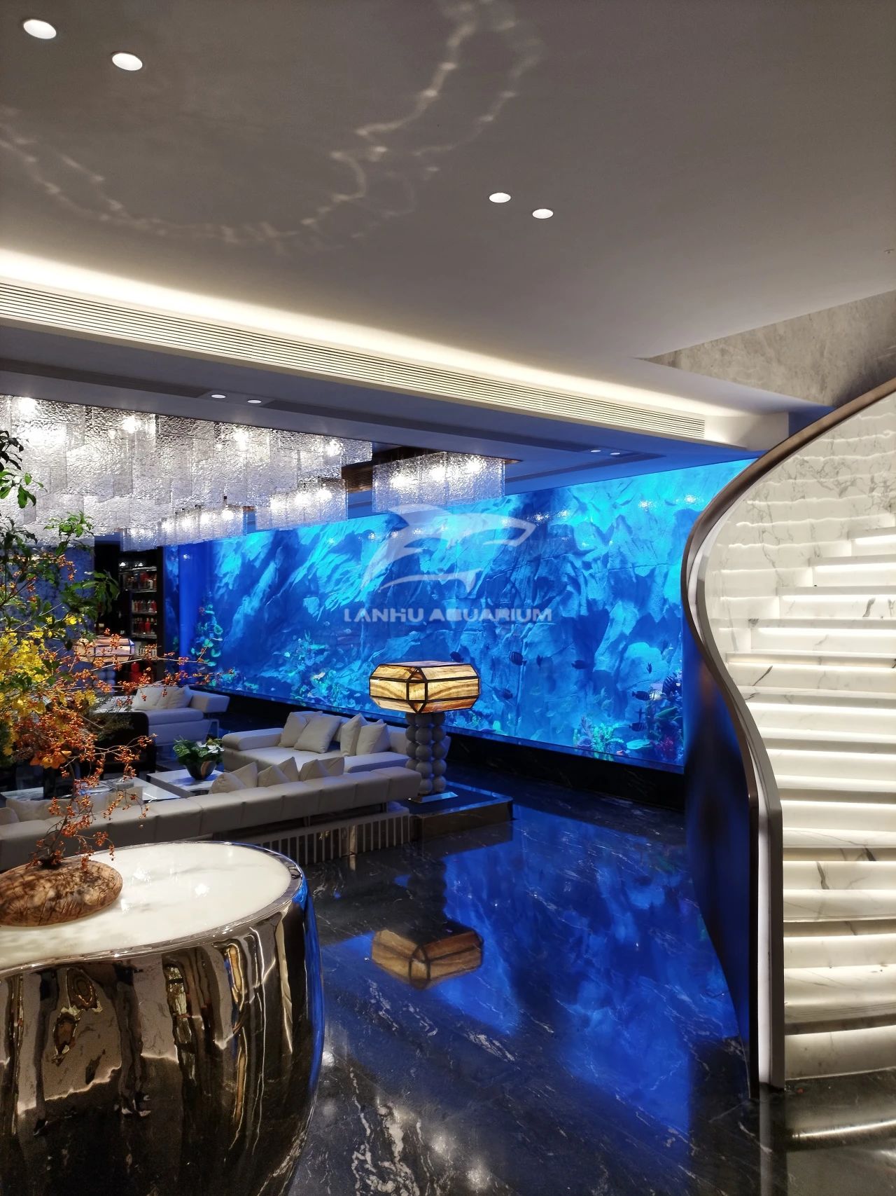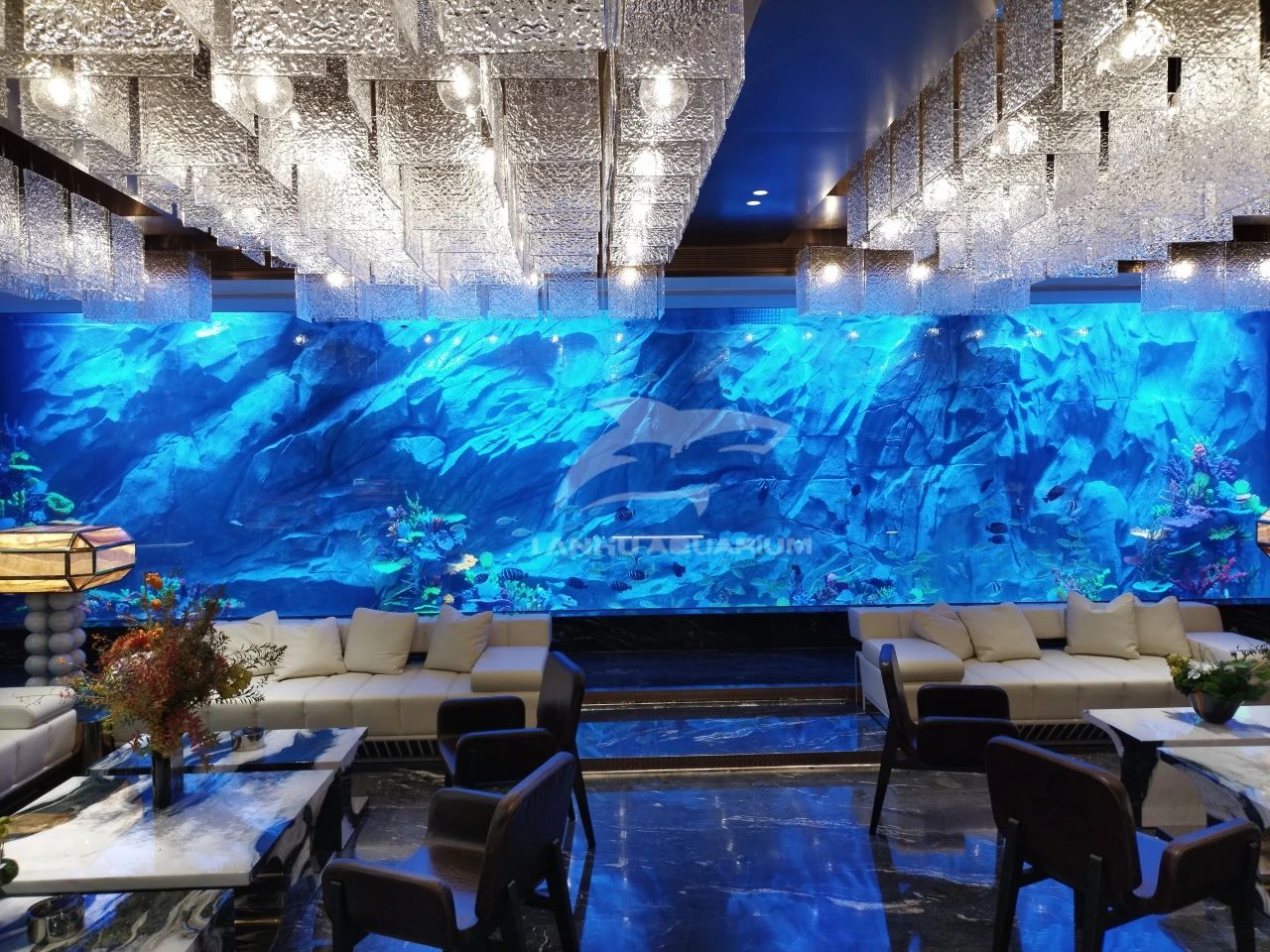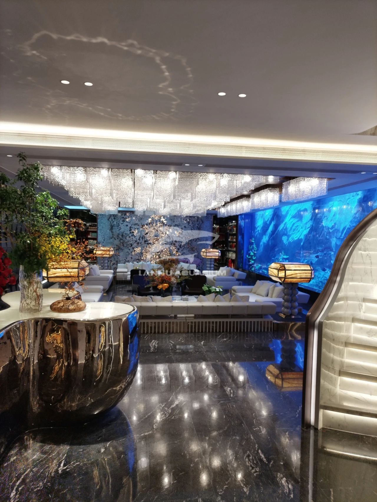 上海蓝湖水族工程有限公司遵循艺术品为前厅点缀雅奢品味,海洋流动形态的鱼缸以自然语序筑造艺术,在奢石与金属线条构成的空间中,置入15米长亚克力玻璃组成的海缸装置,空间流动、浸润之感油然而出,让观者行进的脚步渐缓,“慢享”一处悠然。